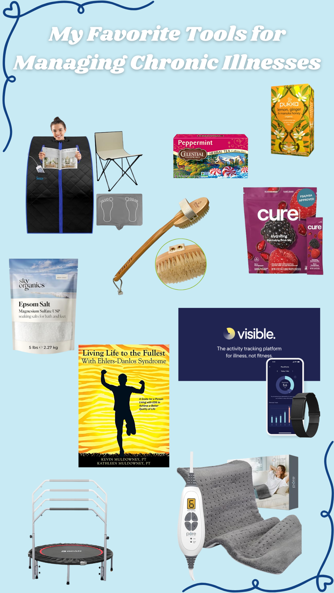 Tools for Managing Chronic Illnesses & Symptoms 21 March 2025 Sophia-Advent Health Tools for Managing Chronic Illnesses & Symptoms My Favorites that Help Me Manage Day-to-Day I wanted to share these tools that have tremendously helped me get through my worst days and my day-to-day symptoms. These items are my go-to's and have improved my overall well-being while dealing with chronic illnesses. I hope this can help. :) Infrared Sauna What it Does: Heats through light Detoxification Improves Cardiovascular Health Pain Relief Relaxation Why it's one of my favorites: While going through Lyme treatment and treatment for mold toxicity, I felt this was a huge help with helping my body sweat and in turn detox I also noticed it helps with joint pain that I experience with EDS I have definitely noticed relaxation from it and my mind always feels calm after References: https://health.clevelandclinic.org/infrared-sauna-benefits Heating Pad: Why it's one of my favorites: Debloating Sometimes after eating, my stomach bloats terribly and it can be painful. I always find sitting with a heating pad to be comforting and help alleviate some of that pain. Helps Alleviate Back Pain Helps Alleviate Stomach Cramping for us ladies during that time of the month Visible Armband & App: What it Does: Tracks your Heart Rate Helps to Monitor your Energy Exertion Throughout the Day Have a Pace Points System (energy). To my understanding, to those who know spoon theory: Points kinda are like spoons. Alerts you when you are in Active Zone (and to take a break if possible) Interactive App Allows you to see your hr and points and also enter your activities throughout the day (this helps me to see what activities are triggering my heart rate) Why it's one of my favorites: As someone with POTS, it is great to see what activities are triggering my heart rate Helps me to not overdo it I honestly love this armband and app for validation of my symptoms as well Rebounder: What it Does: Improves Heart Health Low-impact Helps Lymphatic System Flow Why it's one of my favorites: I like to use mine even for a minute before I go into my sauna to help get things moving/flowing Lymphatic System benefits (I was once told at a clinic that I had sludgy lymph (eww) so I like to use this to help keep things flowing) Dry Brush: What it Does: Exfoliation Detox Increase Circulation Helps Lymph Flow Why it's one of my favorites: I like to do this before a sauna session (for circulation and lymph) or before a shower/bath (helps exfoliate) Bonus makes your skin feel super soft after Epsom Salt Baths: Why it's one of my favorites: I love taking Epsom salt baths for pain relief, relaxation, and to reduce inflammation Electrolyte Drink Mix: What it Does: Hydration Why it's one of my favorites: I feel like these are a necessity when living with POTS, and help the body with overall hydration Tea (Ginger and Peppermint are my Go-To's): Why they're my favorites: Both ginger and peppermint teas have helped or saved me when I have been experiencing terrible nausea. Tip: Keep a few in your purse or wallet for when nausea hits while you're on the go. Helps alleviate nausea, bloating, and improves digestion Is also great to have after a meal (especially when I start feeling that bloating and stomach pain) Cooling Mat: Why it's one of my favorites: Helps with hot flashes While dealing with Lyme and Bartonella I would have awful hot flashes, especially at night. My cooling mat was a lifesaver and allowed me to get comfortable and able to sleep I am unable to find the exact one I have/use but there are a lot of similar options with different sizes available on Amazon Book: Living Life to the Fullest with Ehlers-Danlos Syndrome Why it's one of my favorites: As someone living with EDS, this book is my go-to for exercises to help strengthen muscles and stabilize joints These items are staples in my life and I hope this list is able to help you or give some guidance on symptom relief. Most of these items can be found on Amazon, and if you are interested in any of the exact products that I use and have talked about, I have added the links to each item on my LinkTree: https://tr.ee/kcladC